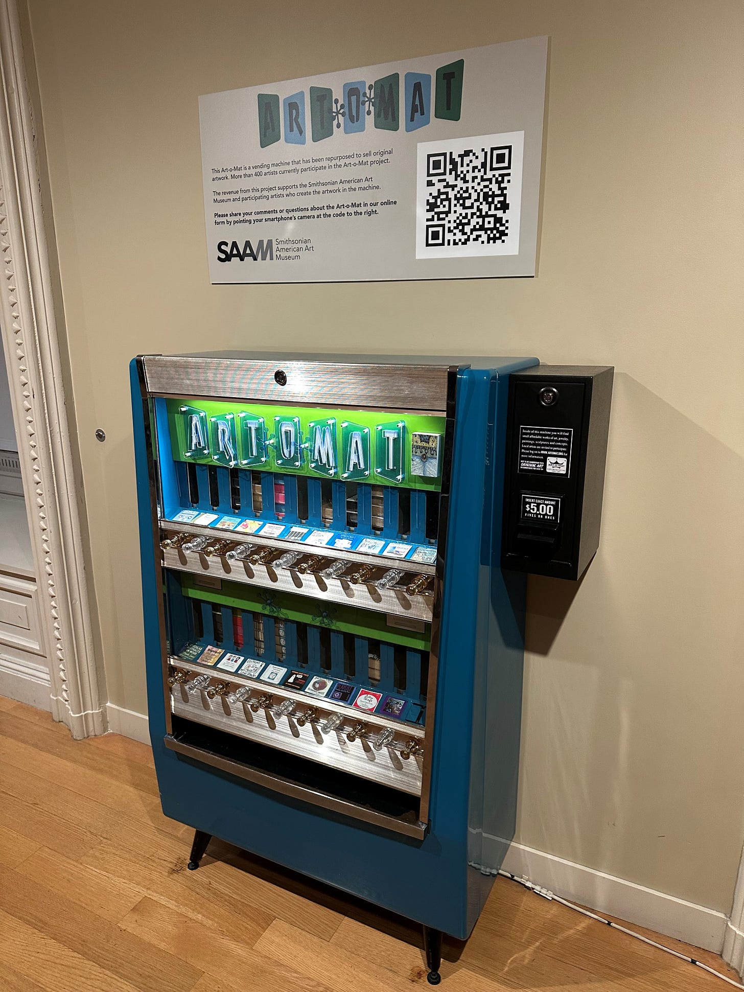 Art-O-Mat! I went from KC straight to DC for work, which just happened to be the day that Smithsonian museums reopened. I made a quick trip to the National Portrait Gallery/American Art Museum and stumbled across the Art-O-Mat machine. I love the concept! For $5, you can select a miniature piece of art or jewelry. Apparently they have these machines all over the country, but this is the first time I’ve seen one of the machines. They are especially plentiful in North Carolina, so no excuse for my Tar Heel friends not to visit one. I bought some art and will return again soon. What a great concept!
