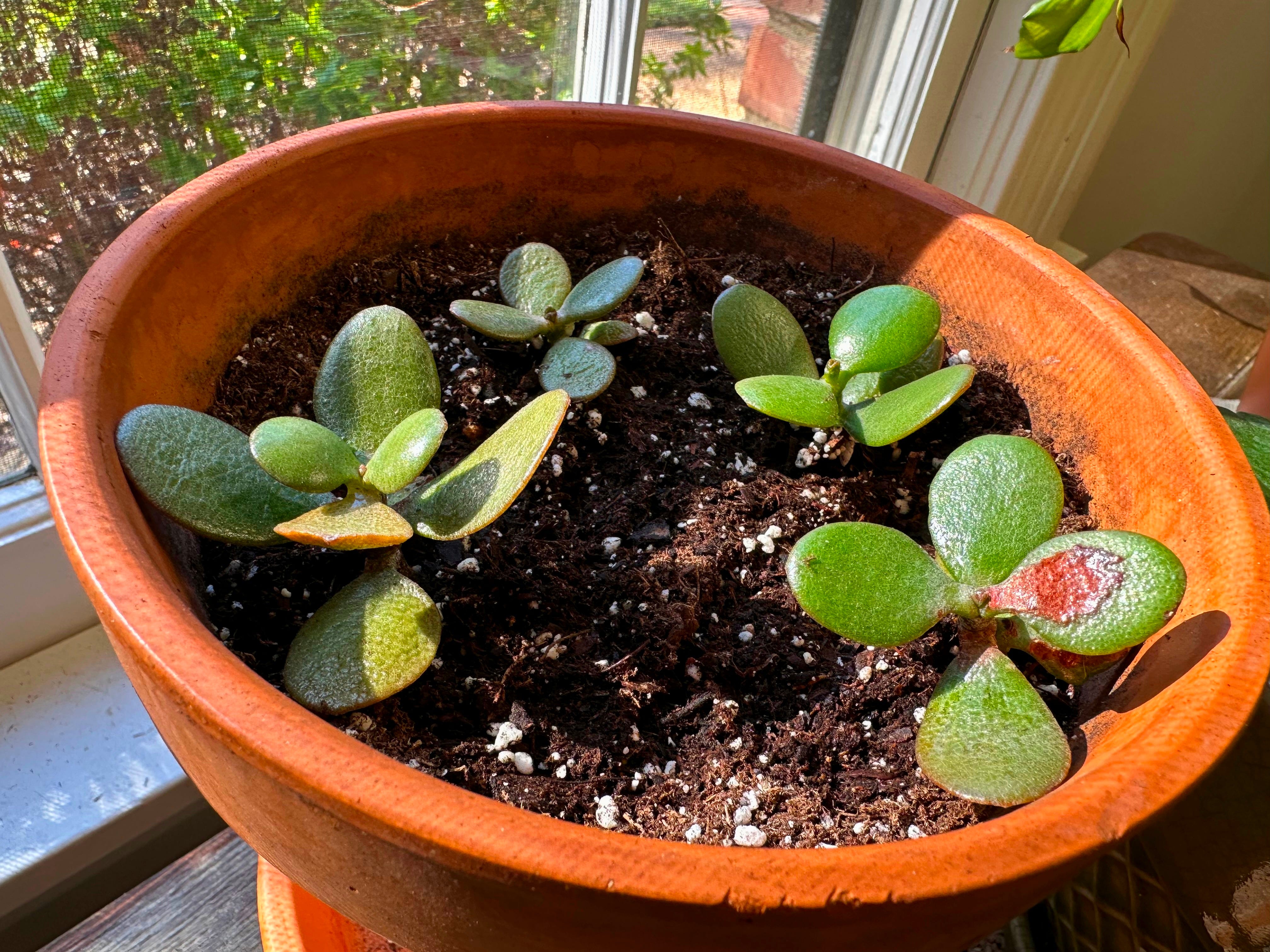 It’s the time of year when I plant “starter jades.” These are generally small plants that started growing over the summer after a healthy leaf fell off a plant. Most of those leaves dry up pretty quickly, but some start growing roots. They don’t need soil or water right away, and I usually wait a month or two to see if they start growing on their own. These four did!